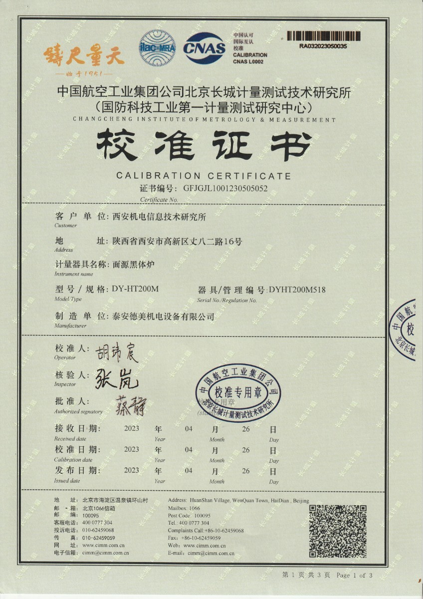 西安機電信息技術研究所 面源黑體爐 校準證書