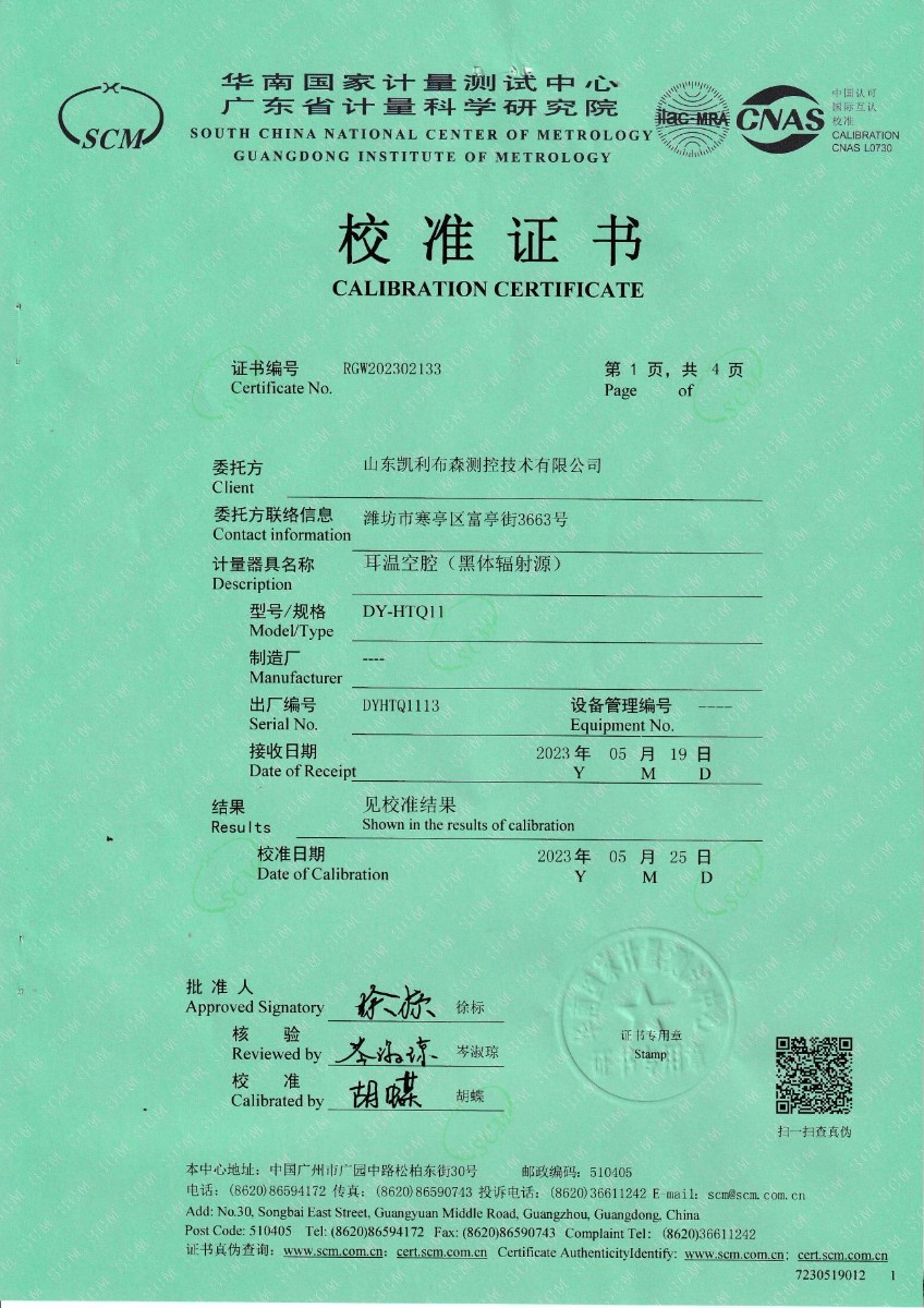 山東凱利布森測控技術有限公司 耳溫空腔(黑體輻射源) 校準證書 2023-6-3 本文被閱讀 13373 次