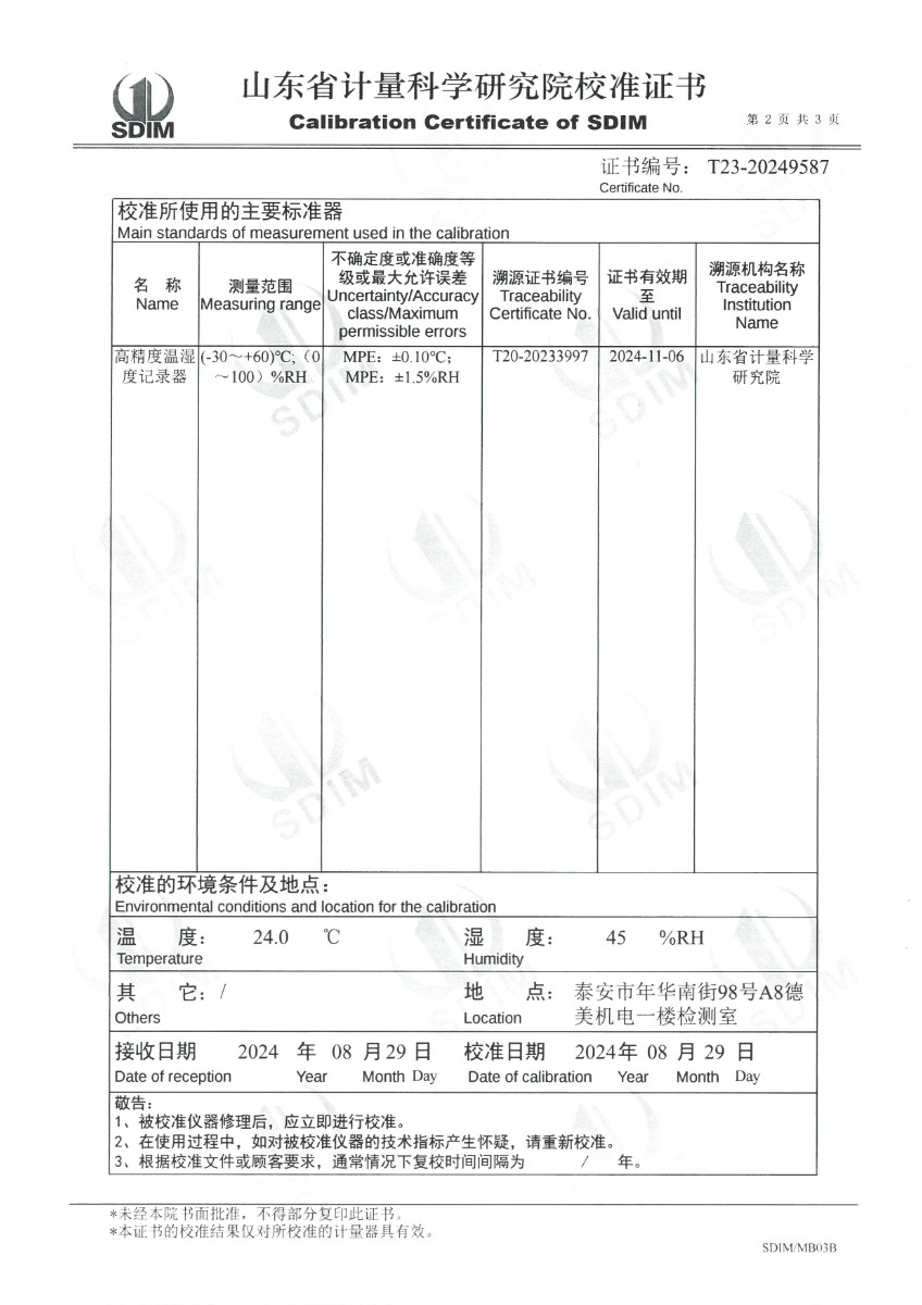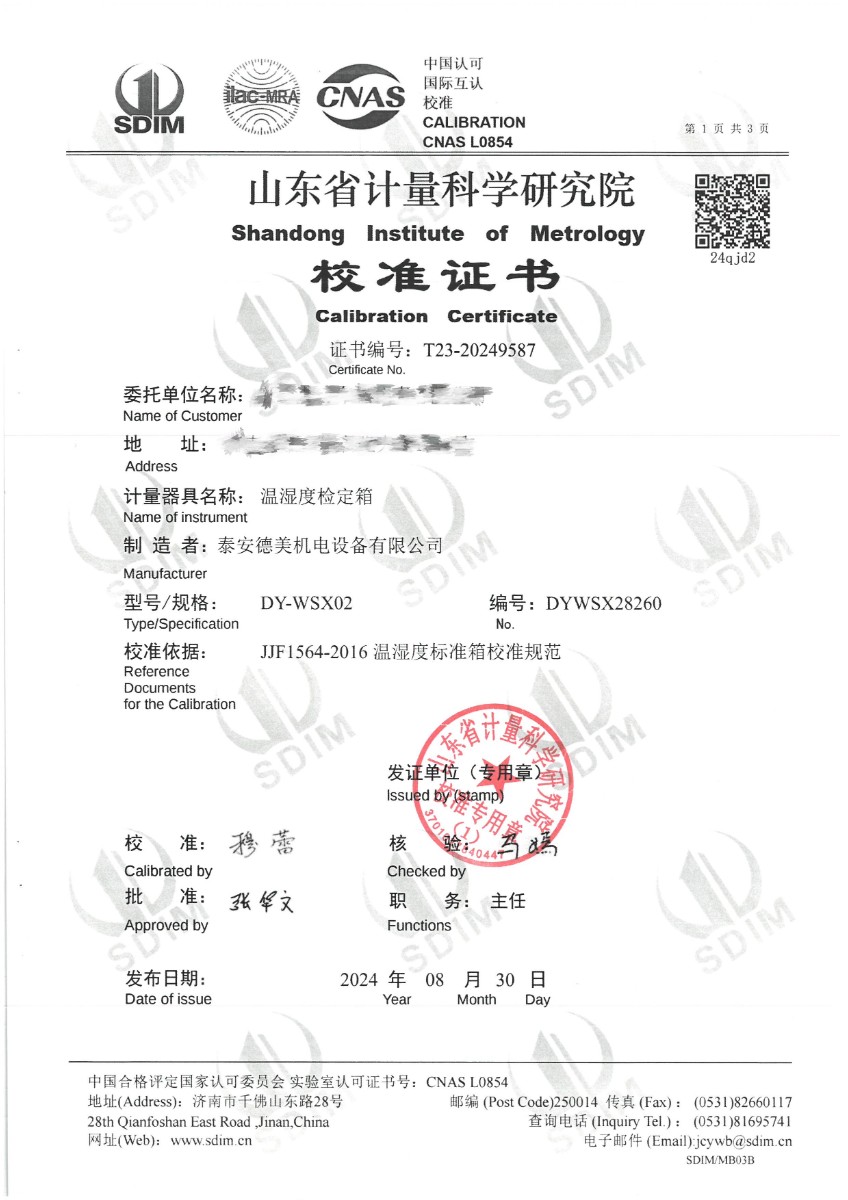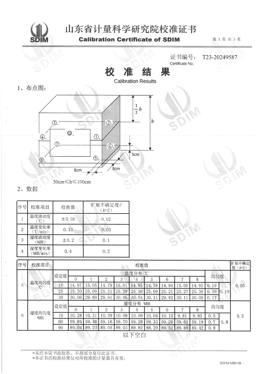 溫濕度檢定箱(-20~80℃)校準證書 2024-9-3 本文被閱讀 6026 次