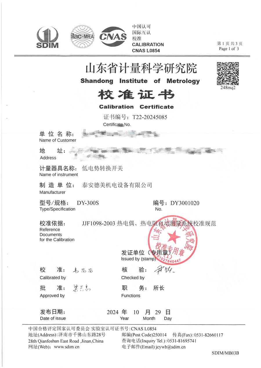 低電勢轉換開關校準證書 2024-10-31 本文被閱讀 7075 次
