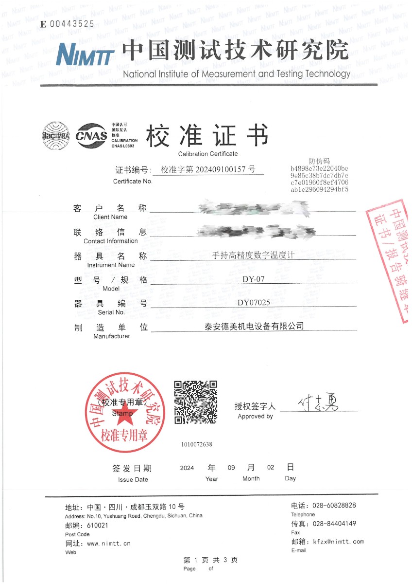 手持高精度數字溫度計(-80~300℃)校準證書 2024-9-6 本文被閱讀 6323 次