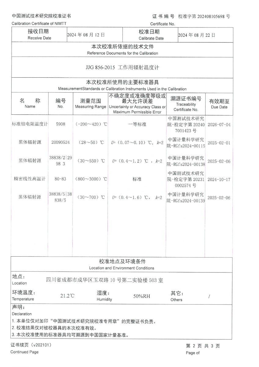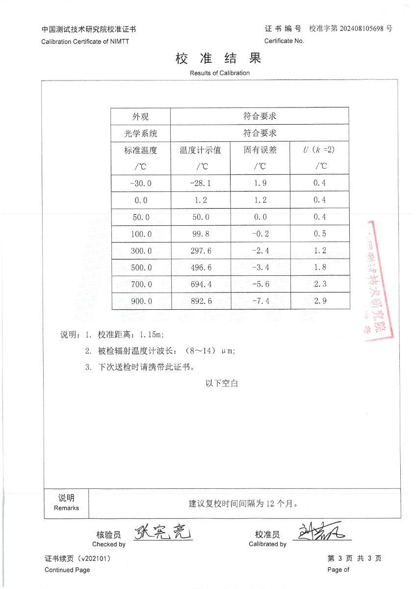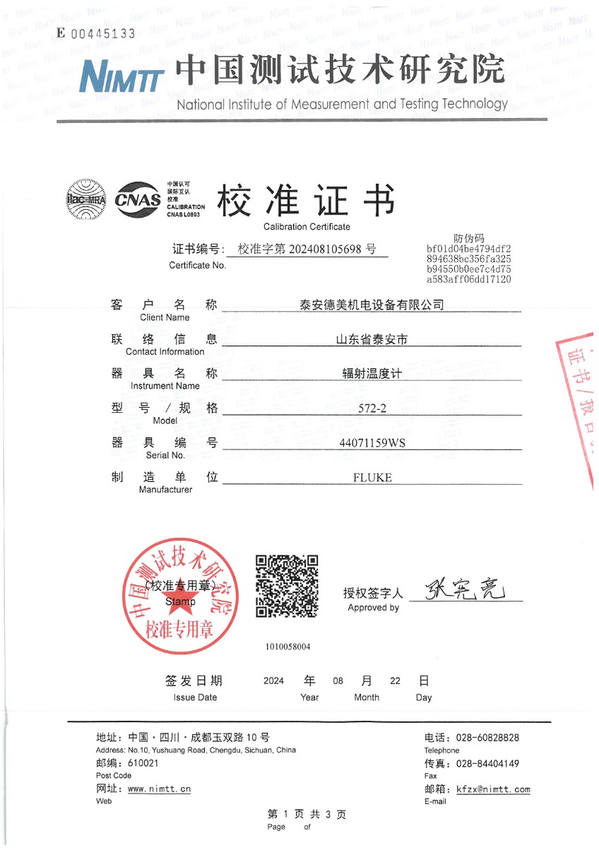 泰安德美-輻射溫度計(-30~900℃)校準證書 2024-9-9 本文被閱讀 6693 次