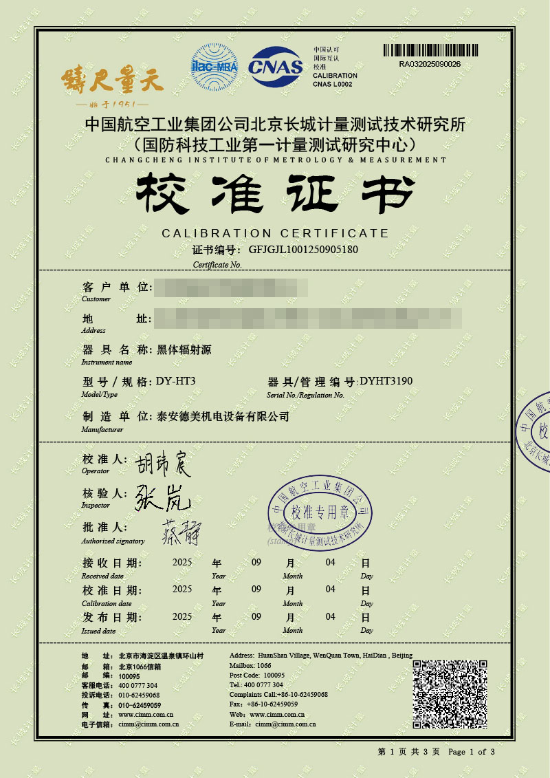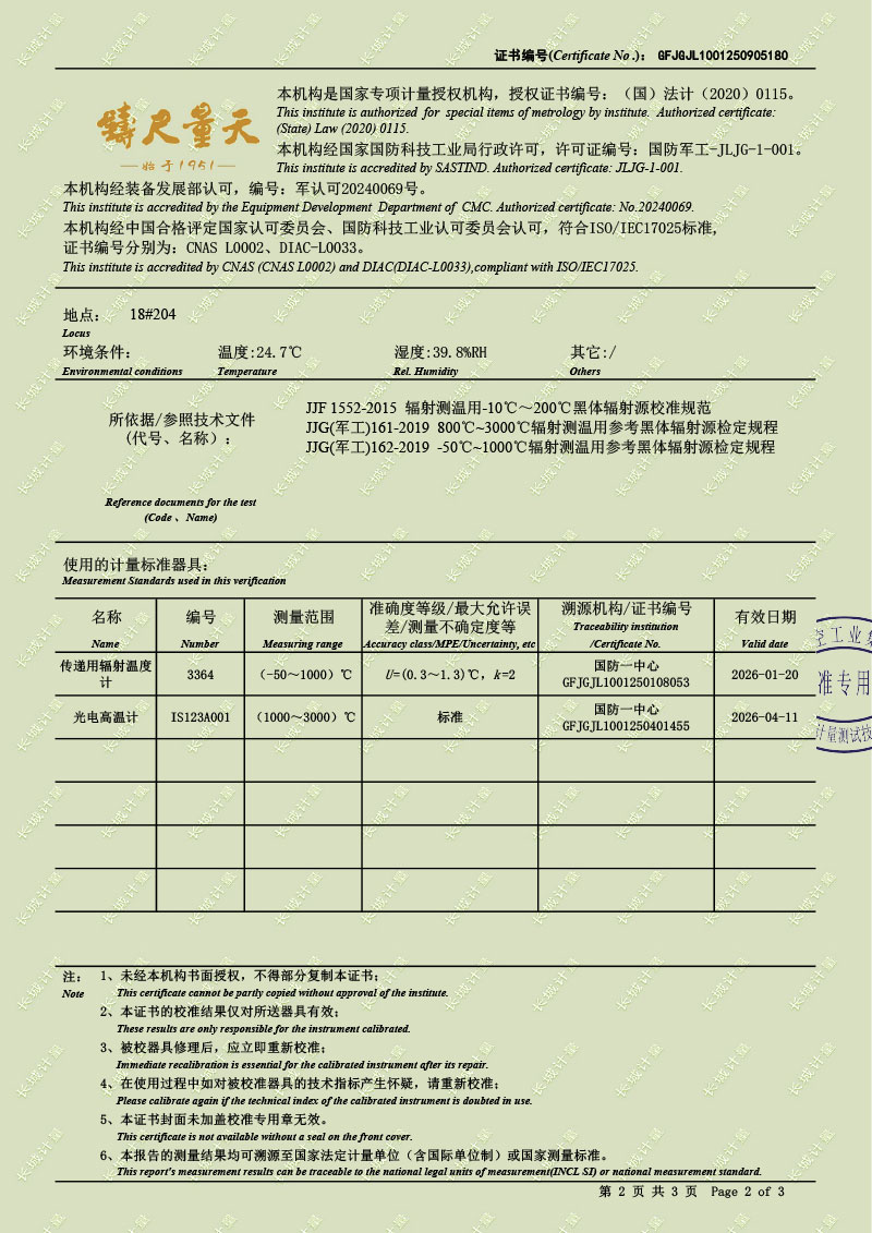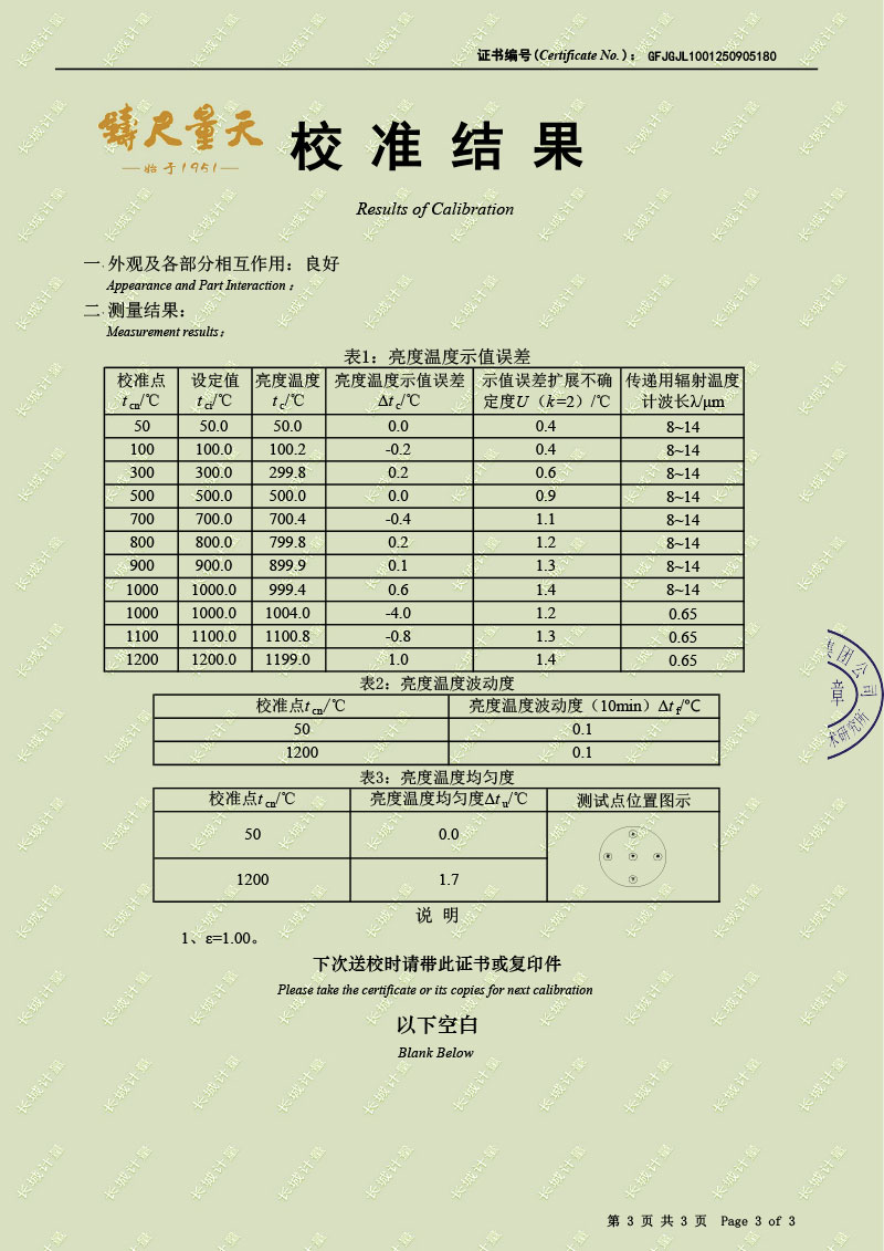 黑體輻射源(50-1200℃)校準證書 2025-9-22 本文被閱讀 1510 次