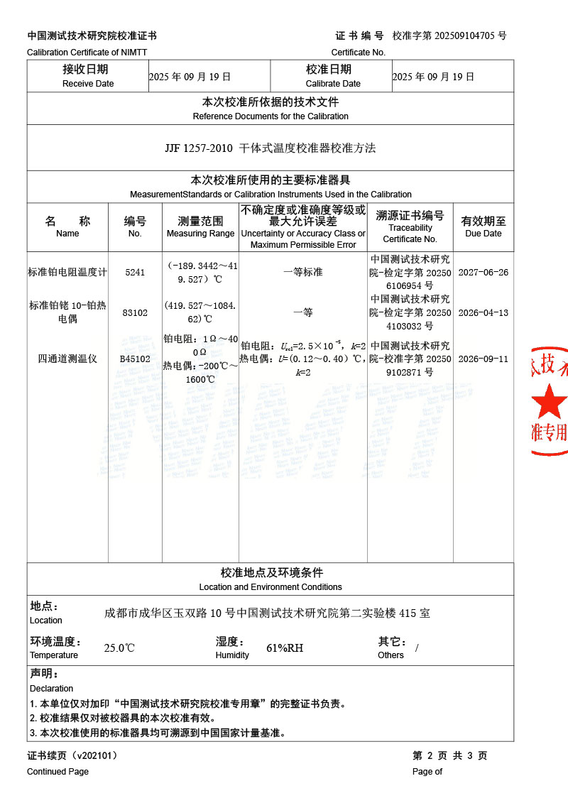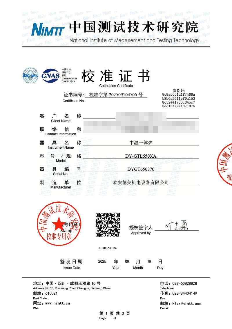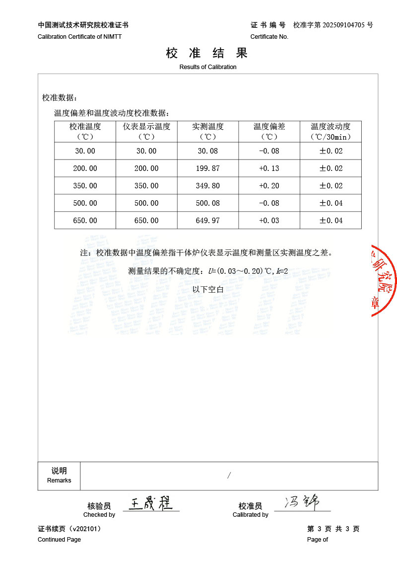 中溫干體爐(30-650℃)校準證書 2025-9-22 本文被閱讀 1741 次