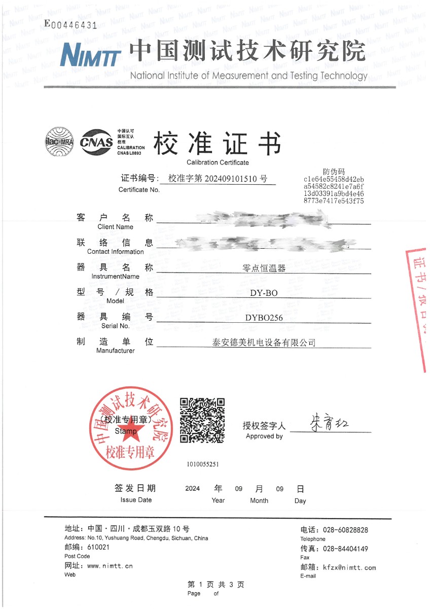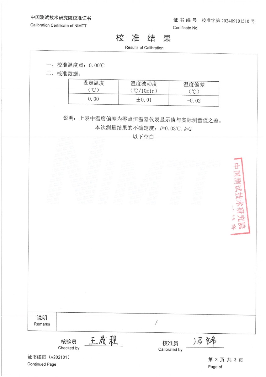 | 上一條:高溫干體爐(300~1200℃)校準(zhǔn)證書 | 下一條:高精度制冷恒溫槽(-80~100℃)校準(zhǔn)證書 |