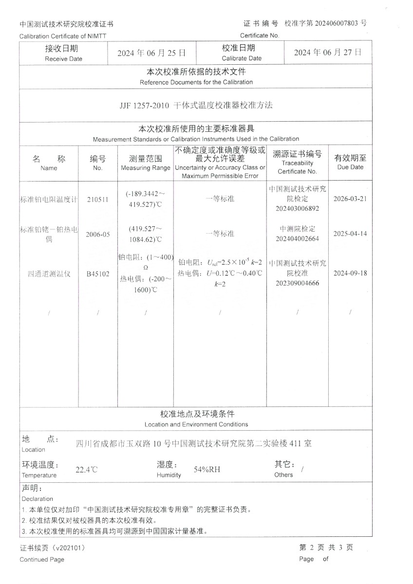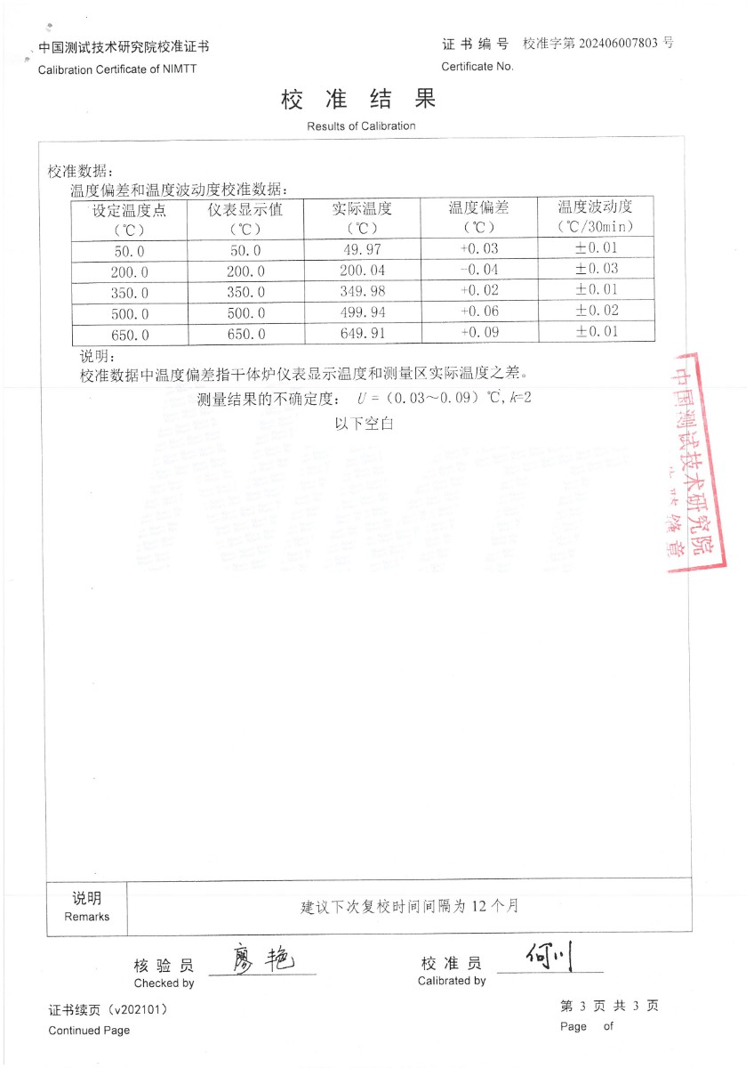 中溫干體爐(50~650℃)校準證書 2024-7-1 本文被閱讀 6506 次