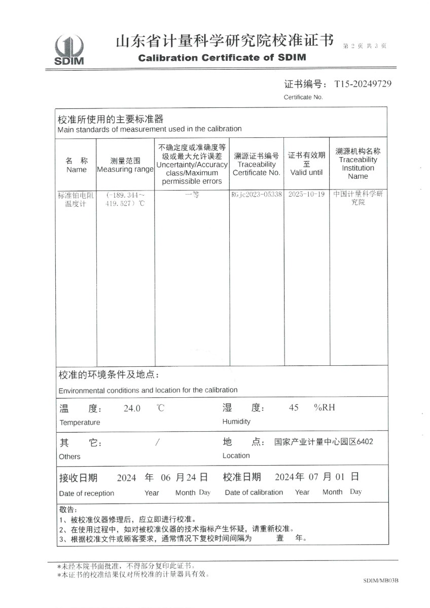 高精度數字溫度計(30~150℃)校準證書 2024-7-5 本文被閱讀 6131 次
