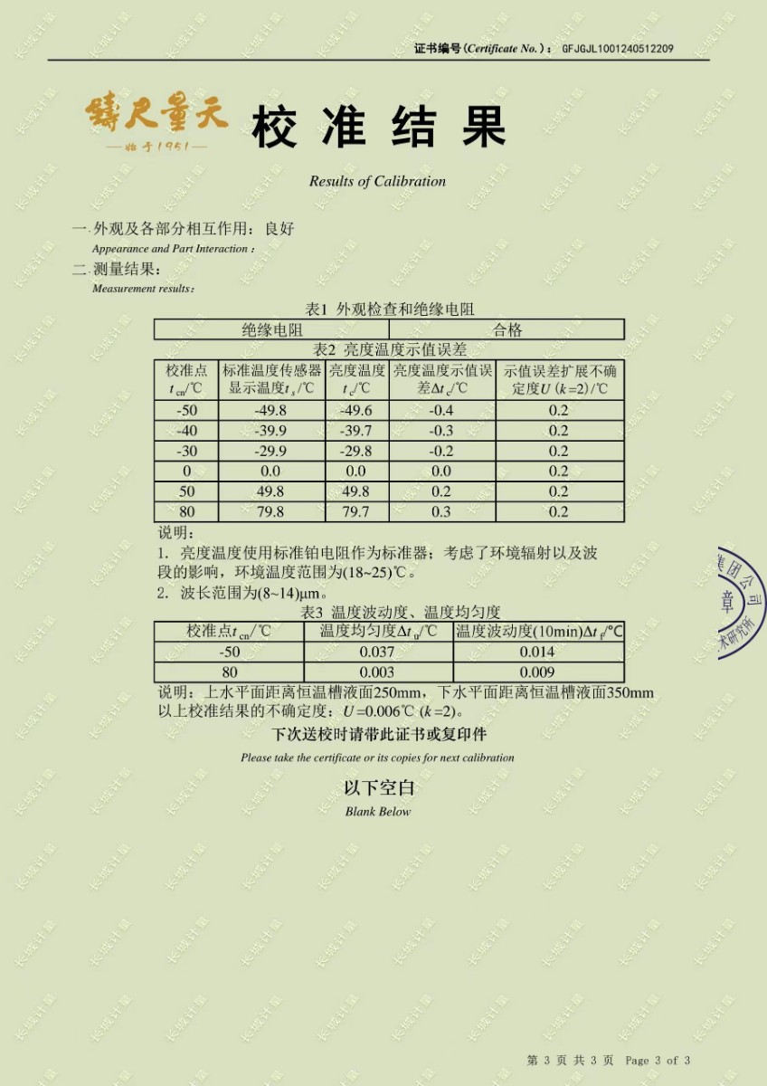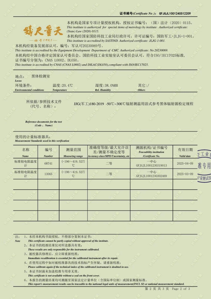 低溫浴式黑體輻射源校準證書 2024-5-31 本文被閱讀 8353 次