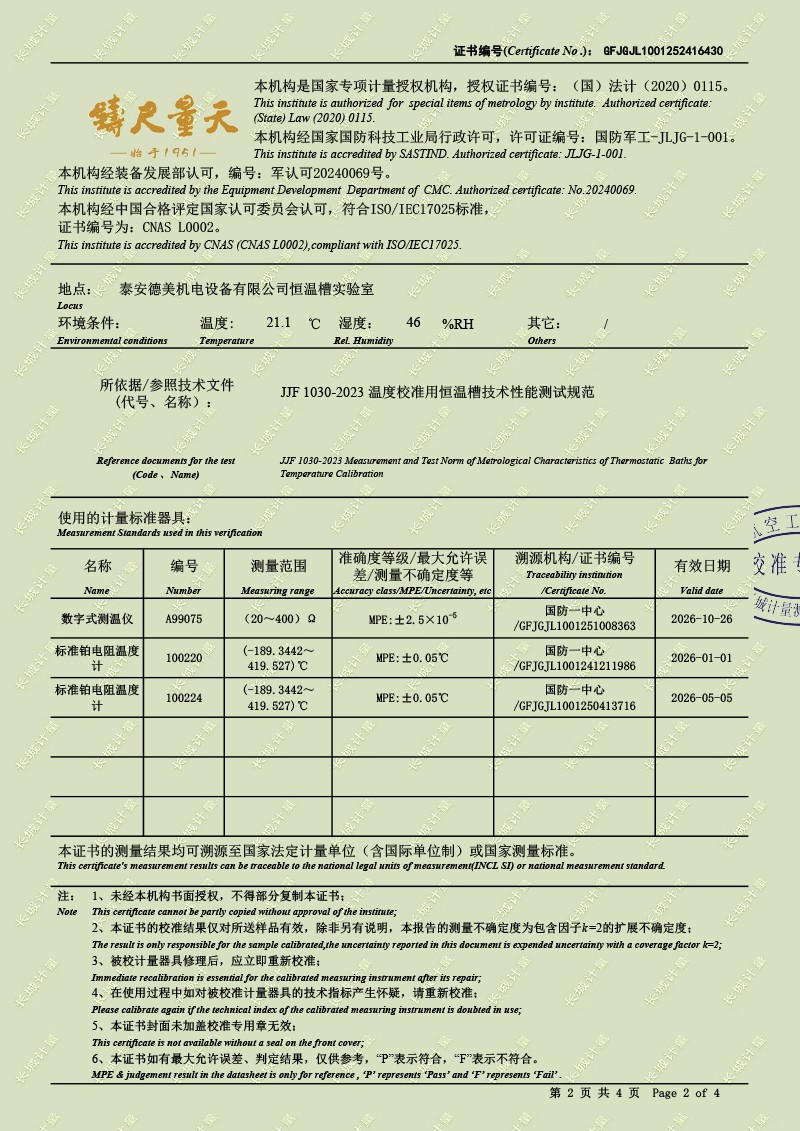 | 上一條:高精度恒溫油槽-校準(zhǔn)證書 | 下一條:高精度制冷恒溫槽(-80~100℃)校準(zhǔn)證書 |