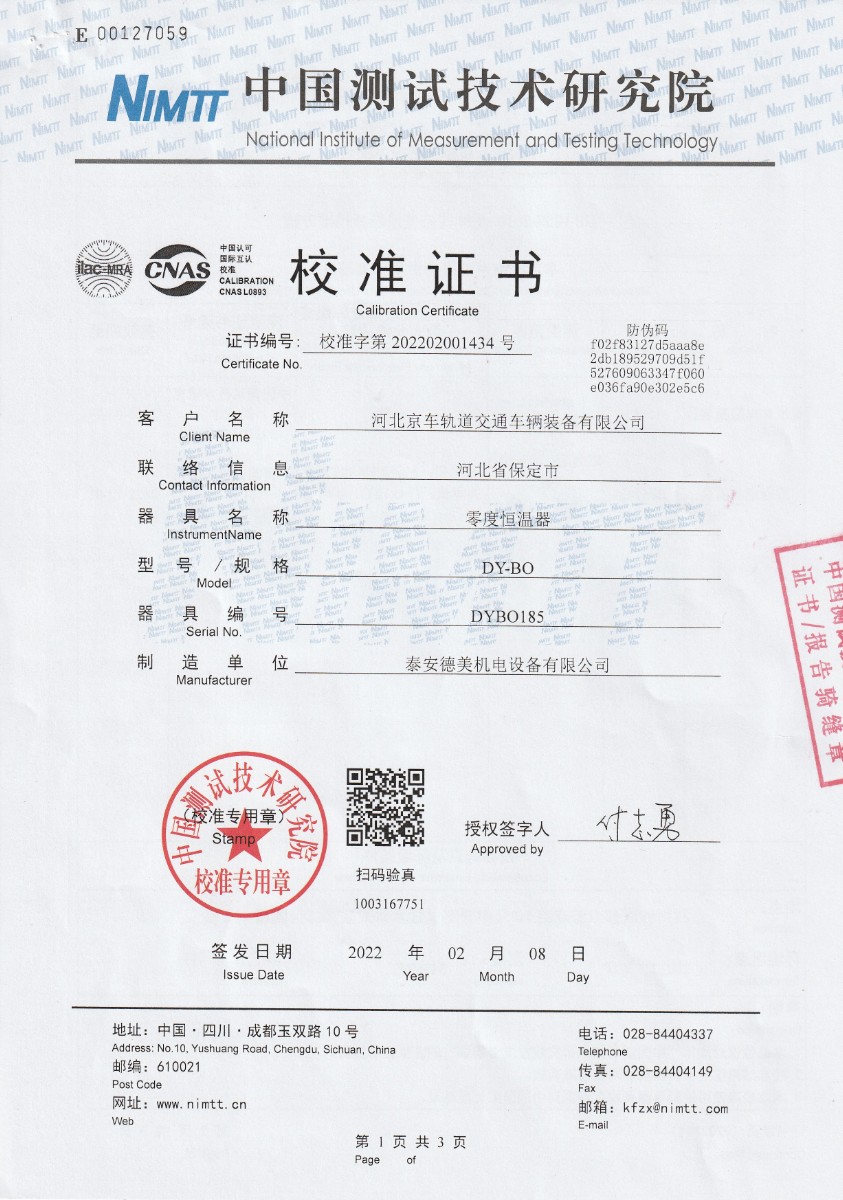 上一條:河北京車軌道交通車輛裝備有限公司S分度補償導線下一條:高精度制冷恒溫槽(-80~100℃)校準證書